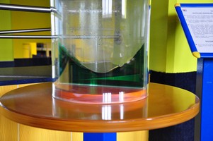 Na otáčivé desce je připevněno skleněné ploché akvárium s obarvenou kapalinou.
